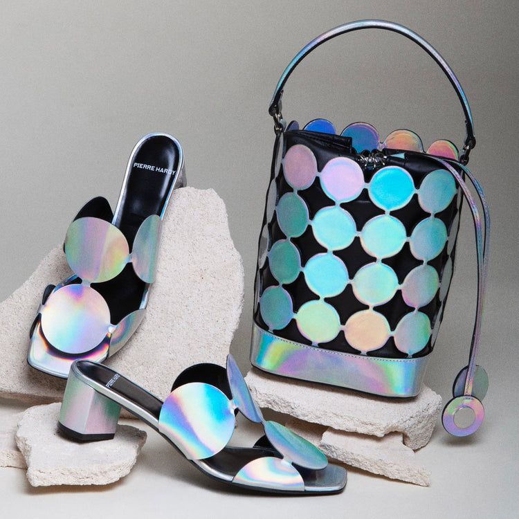 Inspired by Op Art, Pierre Hardy structures these sandals with a perforated disc pattern. The graphic design blends solid and open spaces, combining lightness with visual impact, like a delicate yet sophisticated bubble resting on the foot. The result is a leather mule with an airy silhouette.